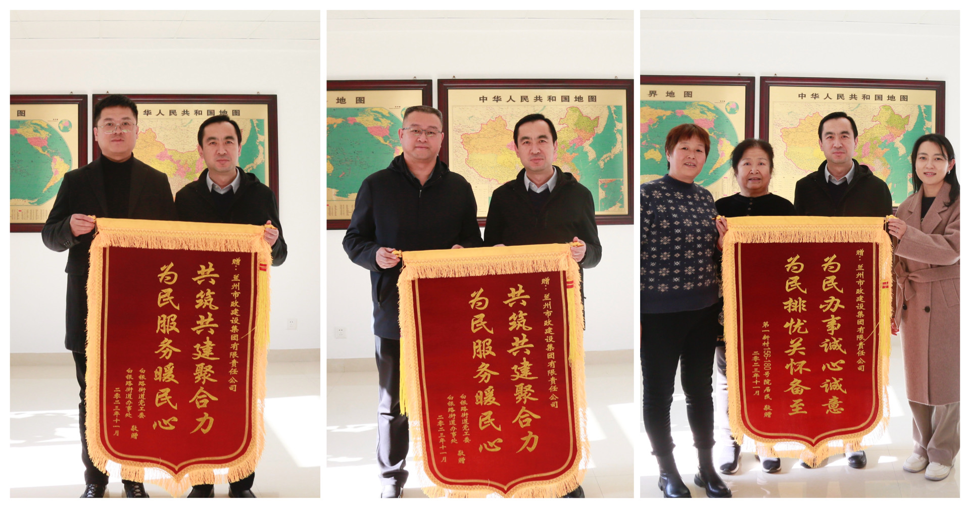 11月16日,白銀路街道黨工委書記馬進、白銀路街道辦事處主任邊懷強、徐家巷社區(qū)黨委書記劉敏,以及第一新村156-180號院居民代表,將兩面錦旗送到了公司,對公司為社區(qū)居民排憂解難,營造舒適溫馨居住環(huán)境表達感謝。